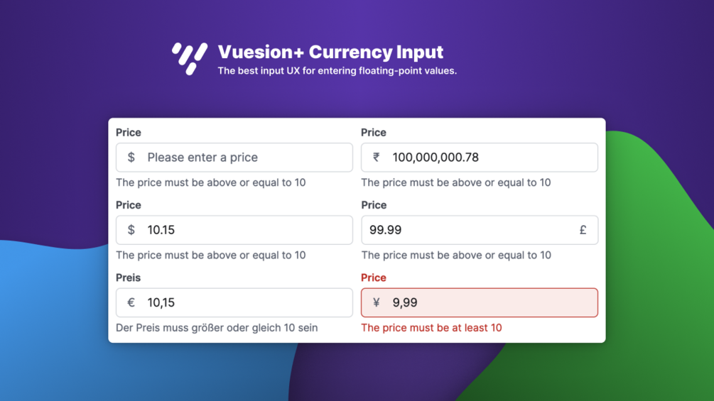 The best input UX for entering floating-point values for @vuesion. Compatible with Vuesion 5+. The Currency Input allows users to enter floating-point values in the specified i18n locale. The input gets automatically formatted while the user types. It supports all locales and currencies and every number-based vee-validate validation rule.